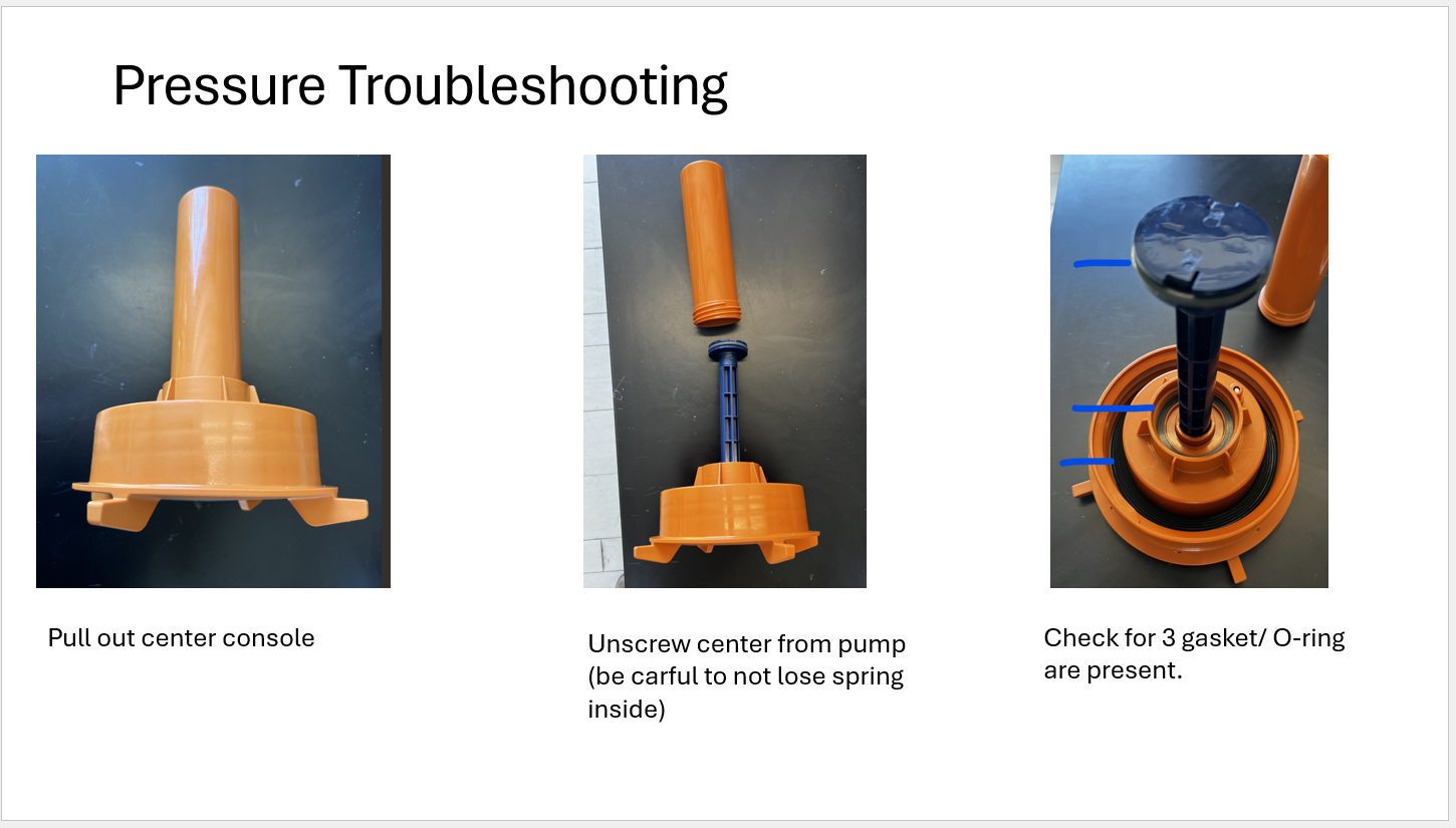 - If water is escaping back into the top of the Escape when pumping, the small silicone check valve on the bottom of the pump handle assembly may be missing or bent. Double-check that this item is there.